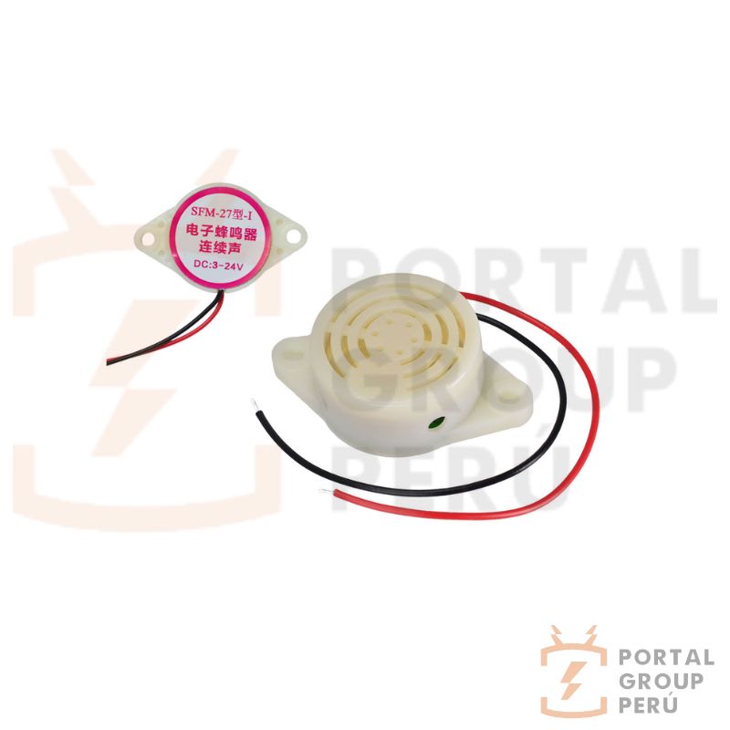 Indicador acustico, Buzzer activo de 3-24 VDC con cablecillo de alimentacion. Dimesiones: 30x15mm. Produce un sonido continuo cuando es alimentado